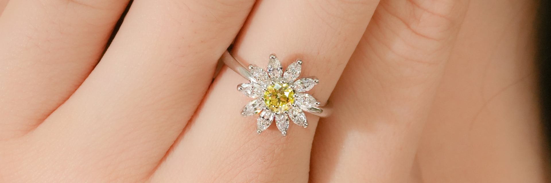 隆重介紹「陽光雛菊」系列,每一件作品都捕捉了沐浴在金色陽光下的雛菊那光彩奪目的美麗。這幅精美珠寶系列以一顆璀璨的黃鑽為中心,象徵著陽光的溫暖與喜悅,周圍環繞著馬眼形鑽石,宛如精緻閃耀的花瓣。